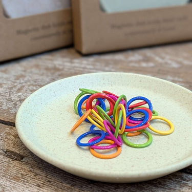 The Cocoknits magnetic Notions Dish is designed to keep small metal notions securely at hand - like stitch markers, safety pins, sewing needles, and more. This dish is 3.5" (9 cm) in diameter and has a strong magnet inside, so you can easily pile stitch markers high. This is the perfect little dish for any knitter, crocheter, sewist, quilter, embroiderer, or anyone who uses small metal tools.
