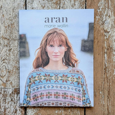 Cover of 'Aran by Marie Wallin' showing a woman in a Fairisle patterned sweater.